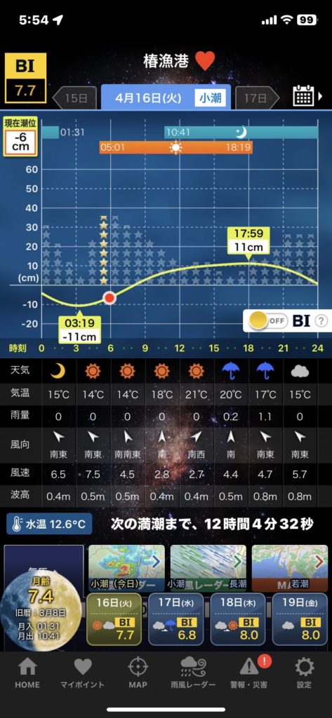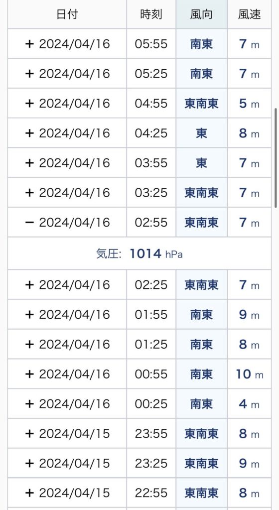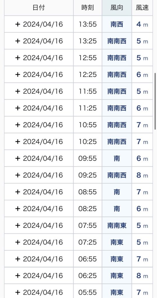 本日予報は朝6時台で南東5.5m…