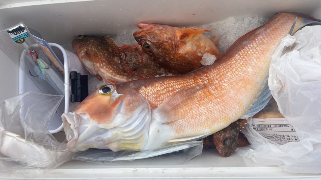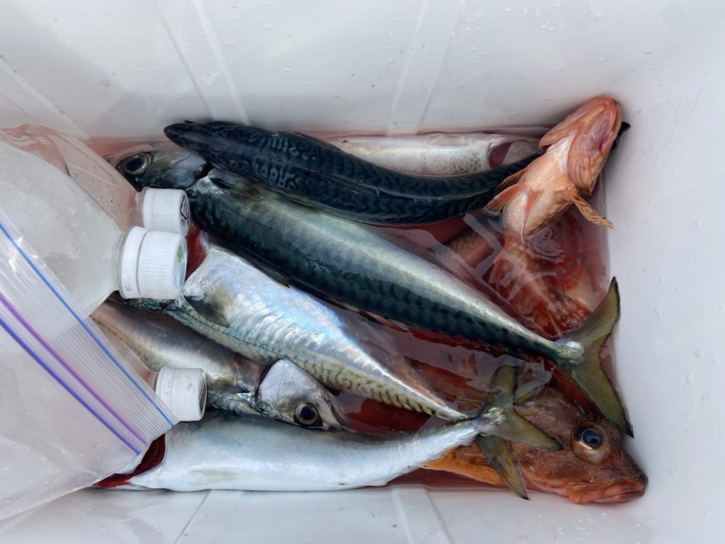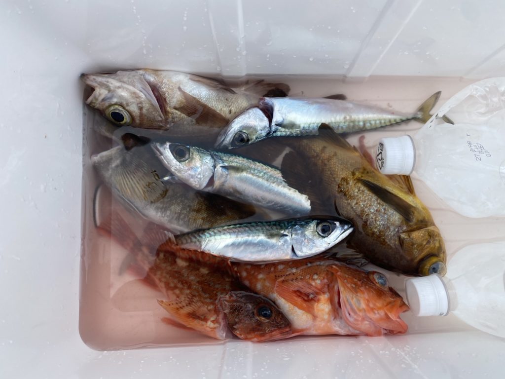 甘鯛(血抜き済で1.37kg)、サバ、ウッカリカサゴ、カサゴ、メバル、メジナ。
