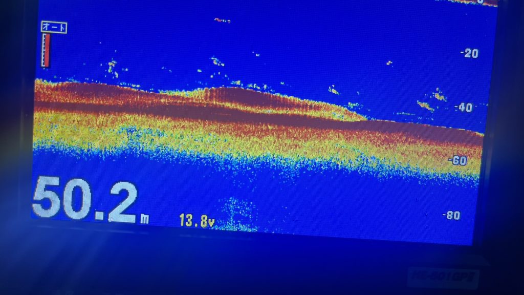 10時半頃、本命地55mも撃沈。反応はあるも食ってこず。前回カサゴ集中的に食ってきた70m地帯へ移動。そこから少しずつ浅くしていく方針に。巻かずに黙ってればやっと食ってきた。けれどもバレる。この繰り返し(´;ω;`)