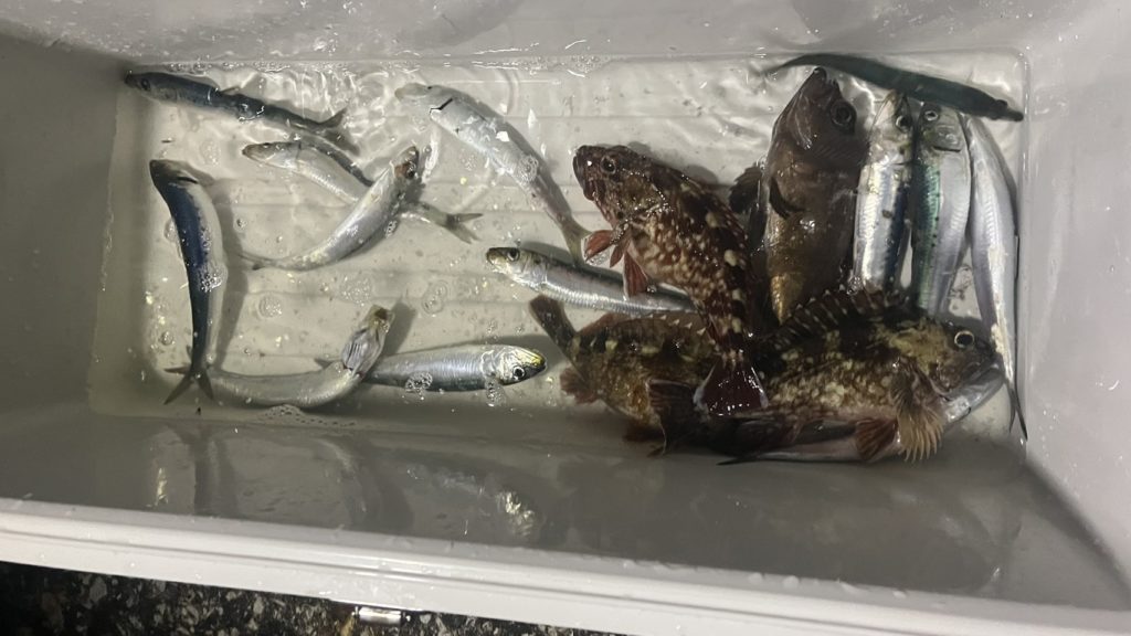 メバル、カサゴ。イワシ(帰港後、浜にて網で掬えました)