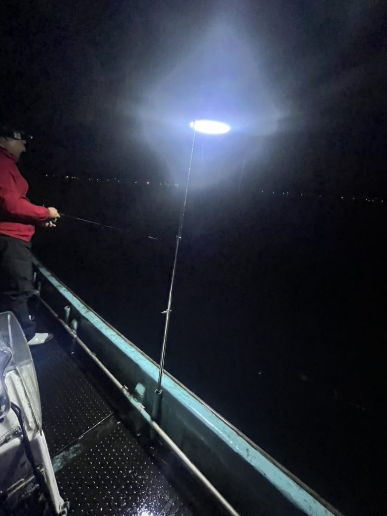 18:56 J 18時半開始。船頭はつばき丸担当。地点Eからスタート。1名様は午後便の船尾だった方で、夜もリベンジです!( `ー´)ノ