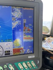 魚探の写真は、丁度大型魚がベイトを追い回してる反応の時のものです。赤い魚は60cmオーバー。茶色っぽいのが40〜60cm。青が30〜40cm。30cm以下は点々でベイトの群れとなっております。大型魚が小魚を追い回している様子が分かるでしょうか🍴(°∀°ミэ)Э