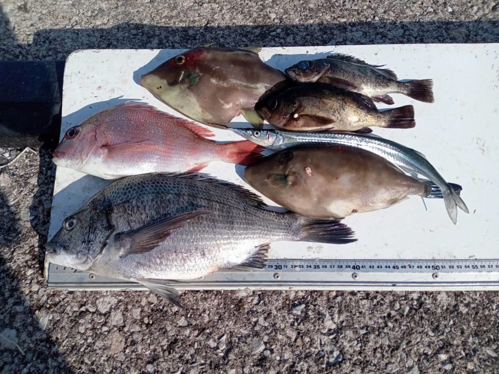 <釣果>赤1枚(30cm)、ウマヅラハギ(2枚)、メバル2匹、サヨリ。エサ取り[アジだらけ]