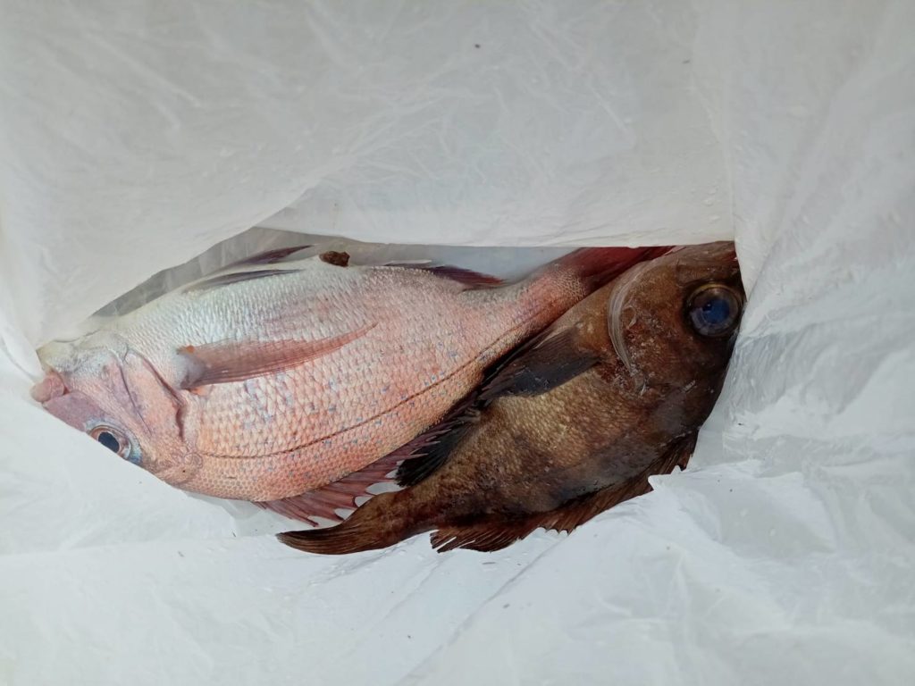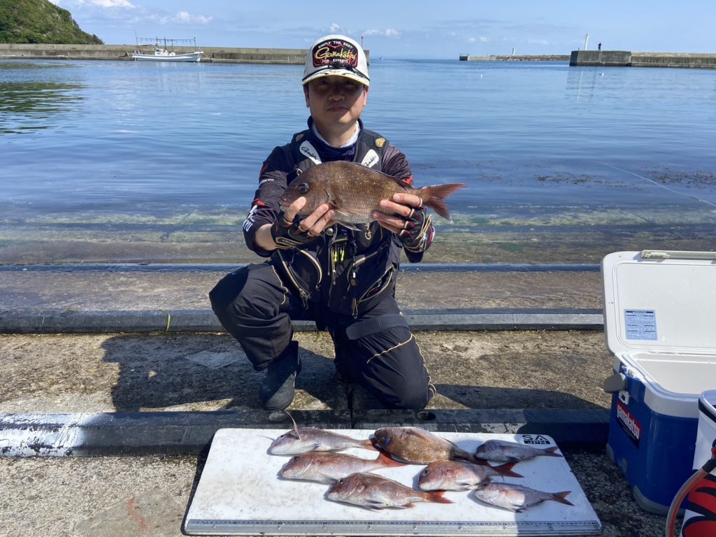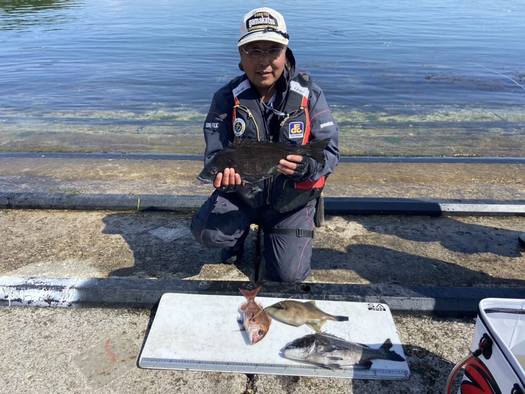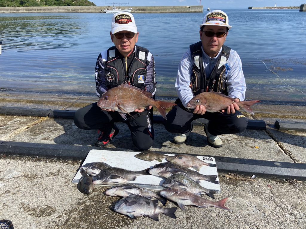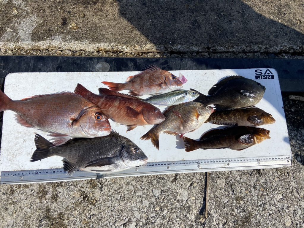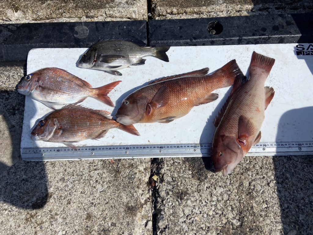赤3枚(~55cm)、黒5枚(~47cm)、イシダイ(約30cm)、ウマヅラハギ2枚(~36cm)、メジナ1枚。+α(赤1,黒3くらいリリース)
