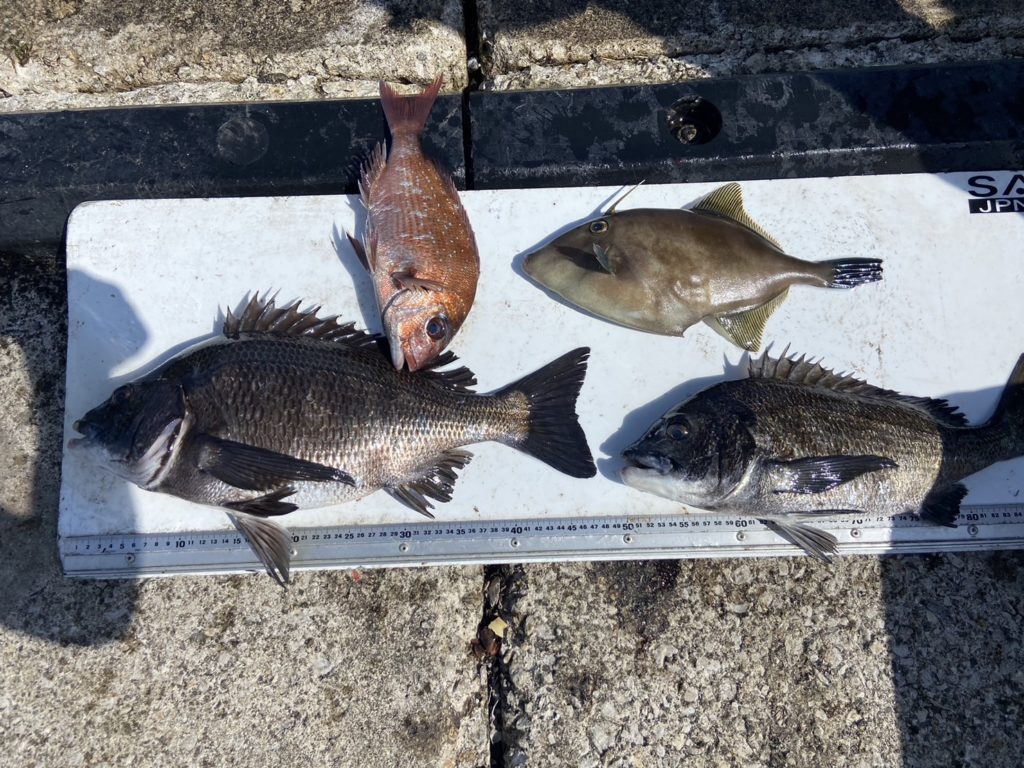 赤1枚(30cm)、ウマヅラハギ2枚、メバル2匹、サヨリ。エサ取り[アジだらけ]