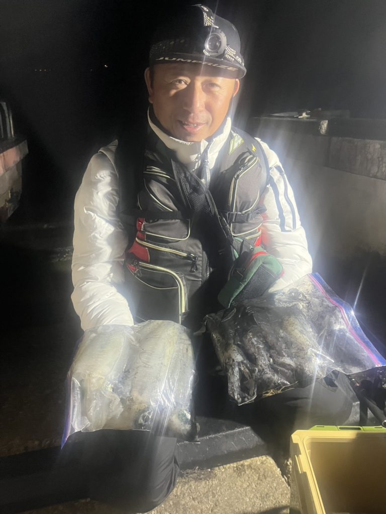 餌取りは、日中はベラ、サンバソウ少々。夜になるとアジ少々。夜中、寒かったそうです🥶