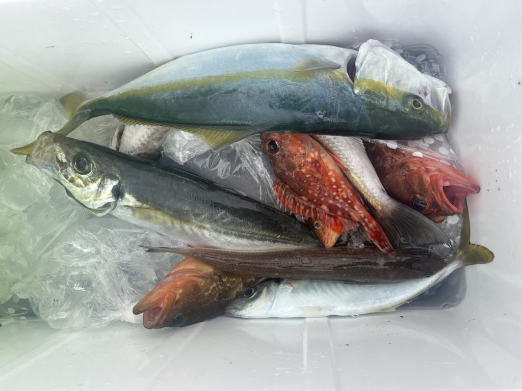 エソ、ベラ、キジハタ、カサゴ、金魚マダイ、ワカシ、イナダ、アジ、メジマグロ(リリース)