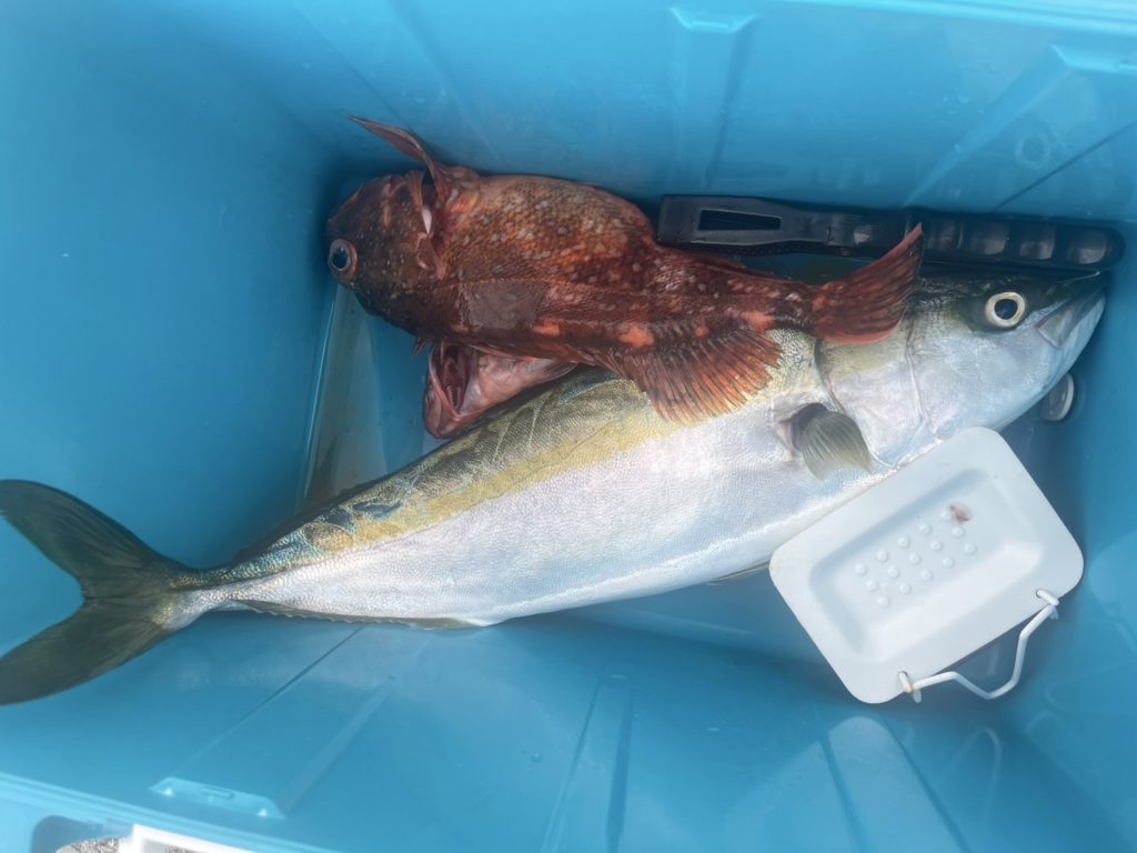 後半、もう一箇所の本命ポイントへ向かうも、ベイト反応は皆無。たまにポツポツと反応ありましたが、夕マヅメ手前になってようやくマダイやワラサ、大きなカサゴ等が釣れ始めました💦