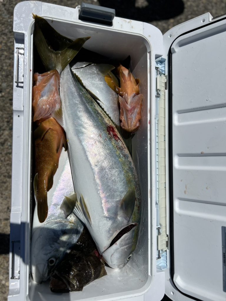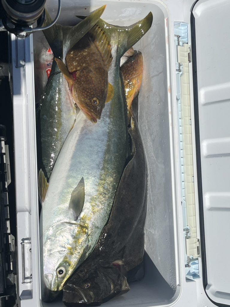 ワラサ2本、ブリ1本、ヒラマサ70cm、ヒラメ60cm、キジハタ5匹程、カサゴ2匹。