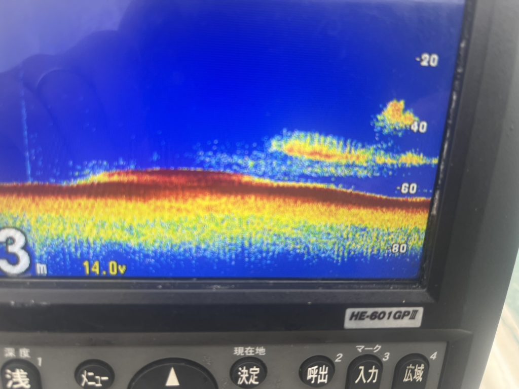 魚探反応は、アミエビベイトがあちこちで出たり消えたり、そのベイトを追うように底の方で大き目の反応が出たり消えたりを繰り返しています。