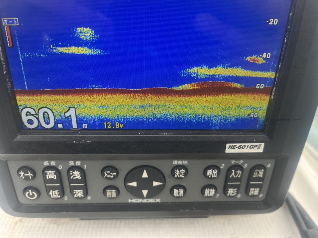 「そこ魚が答えるんや!」と笑ってしまいましたがひとまず直下に合わせて追いかける事に。いずれも砂地で50mスタート→北西へ進んで68m→南西へ進んで80m→北西へ進んで89m→南西へ進んで98mと、上がって来たと思えば走られて底で待機、上がって来たと思えば走られて底で待機を繰り返し水深100mまで連れていかれました(;´・ω・)