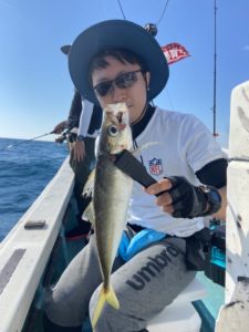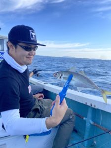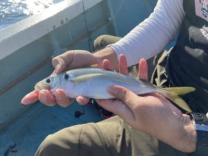 まずは朝一、予報通り東南東。元の予報よりは東寄りでしたが、強風でうねり強く、とても釣りづらかったです。最初のポイントで大アジが大量に釣れて、喜んで頂けました。アジといえど、35cm、40cmとかなりのサイズでしたので、早速の大物釣果ですね。