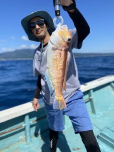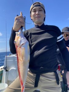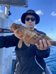 アマダイが飽きてきた頃、昼近くに椿沖の根魚を狙ったところ、良型のキジハタが釣れたりして終始笑いの絶えない釣りとなりました。