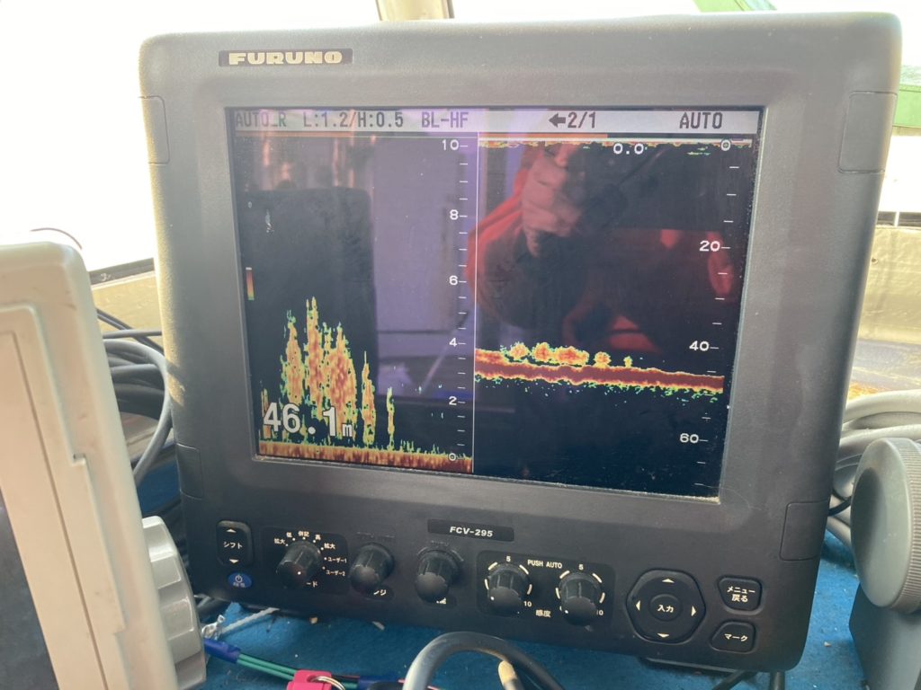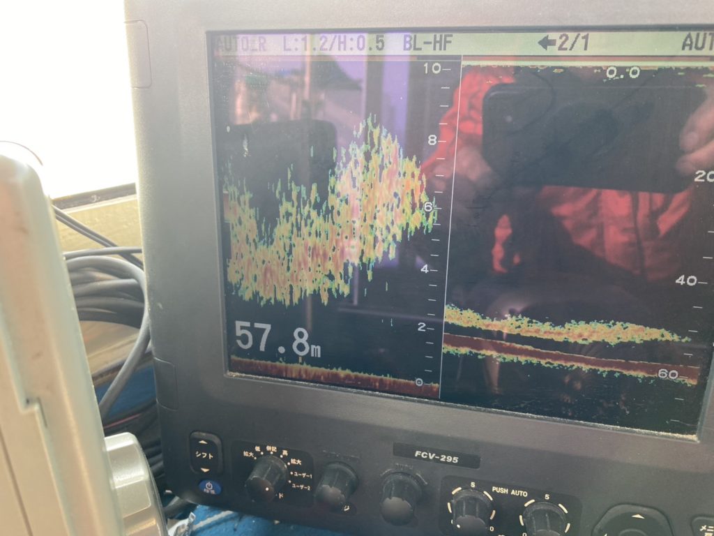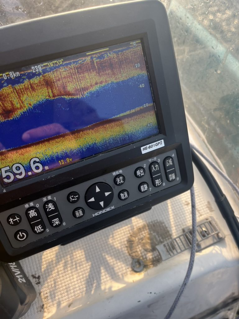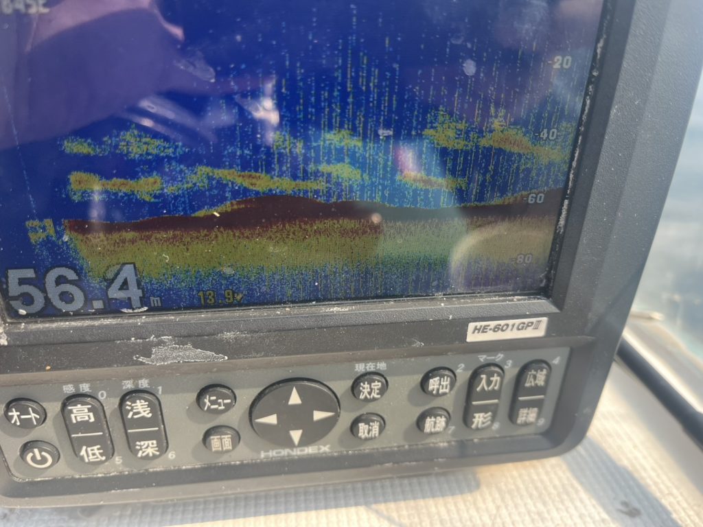 ちなみにさっきまで永幸と同じポイント流していたのですが、この辺りで永幸含めほとんどの船はどんどん深場へ移動していますね・・・。浅場根回り駄目だったのだろうかとちょっと不安になりました(;´∀`)
