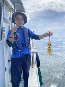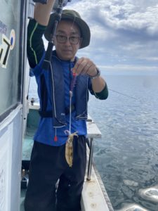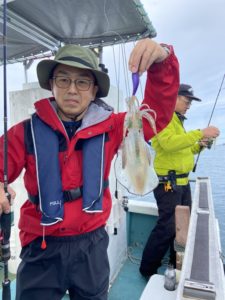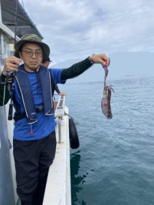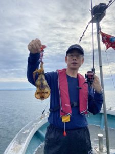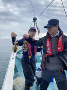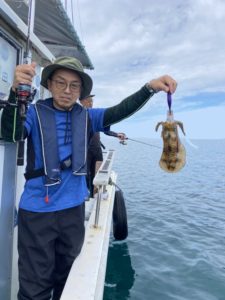 気を取り直して二投目。今度こそアオリイカヒット!しかしその1杯で釣れ高はピタリと止まってしまい、魚探の反応も薄いです。お客様も新しい場で十分楽しめたようなので、元の魚探反応ポイントへ戻りました。お時間が迫って来たのですが、店長もお客様もまだまだやる気。「30杯釣るまで帰しません!」とジョーク混じりに宣言し、しっかりと計30杯釣るまで楽しんで頂きました。