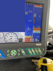 特に、無風でほとんど船が流れない点です。風が無い限り、もはや流れに任せずに自分達で動いて探していくしかありません。その際に本日大変便利だったのは魚探でした。当店で集計しているデータの中から対象ポイントを厳選し、魚探でイカらしき反応を探りながら船を運びました。