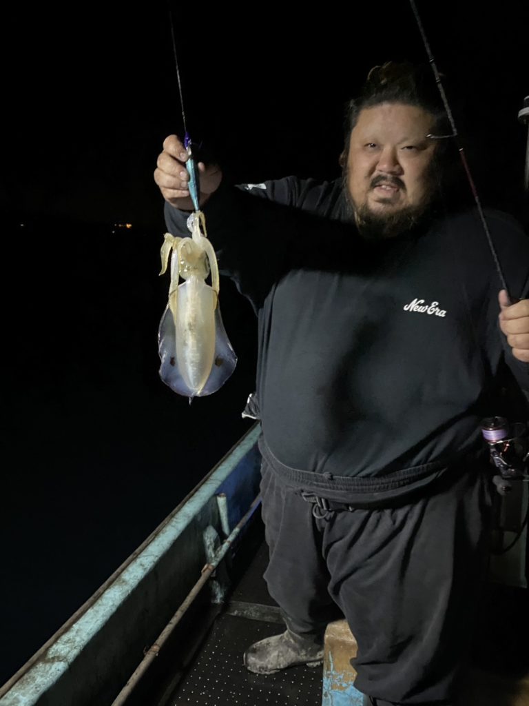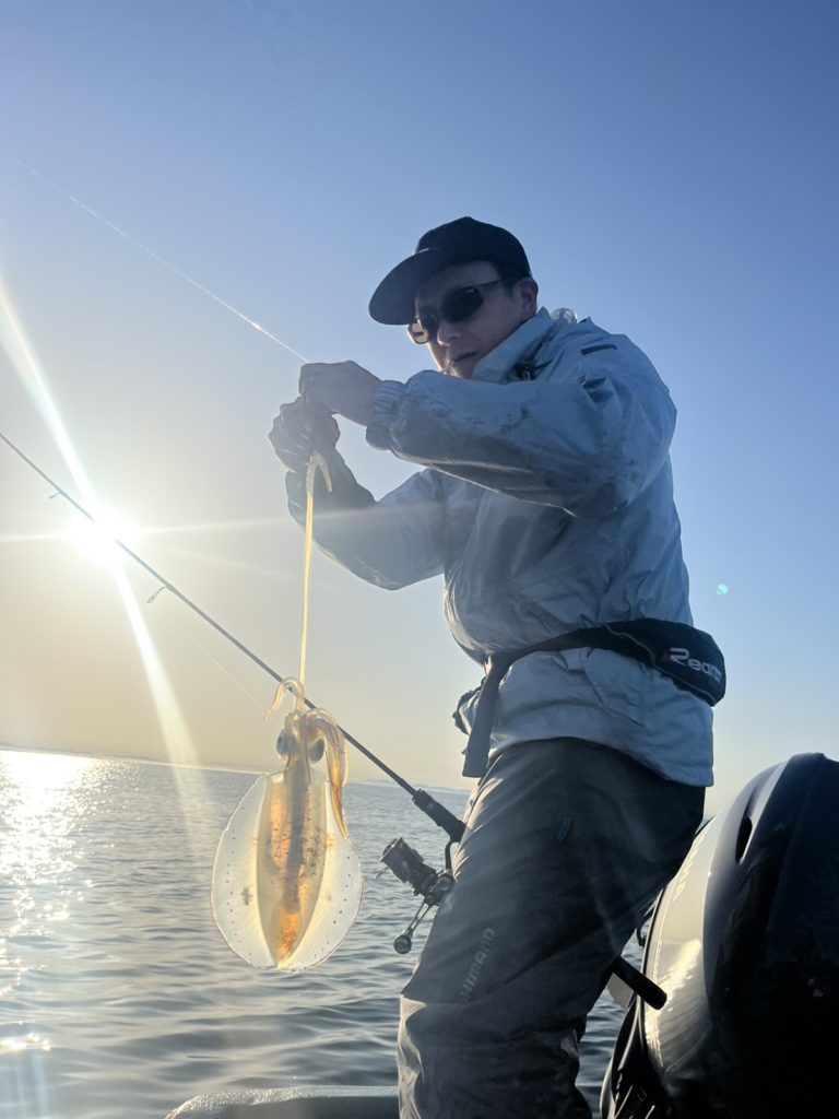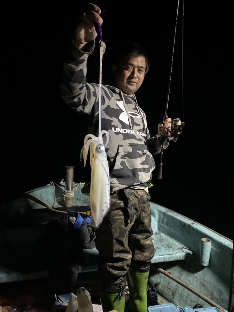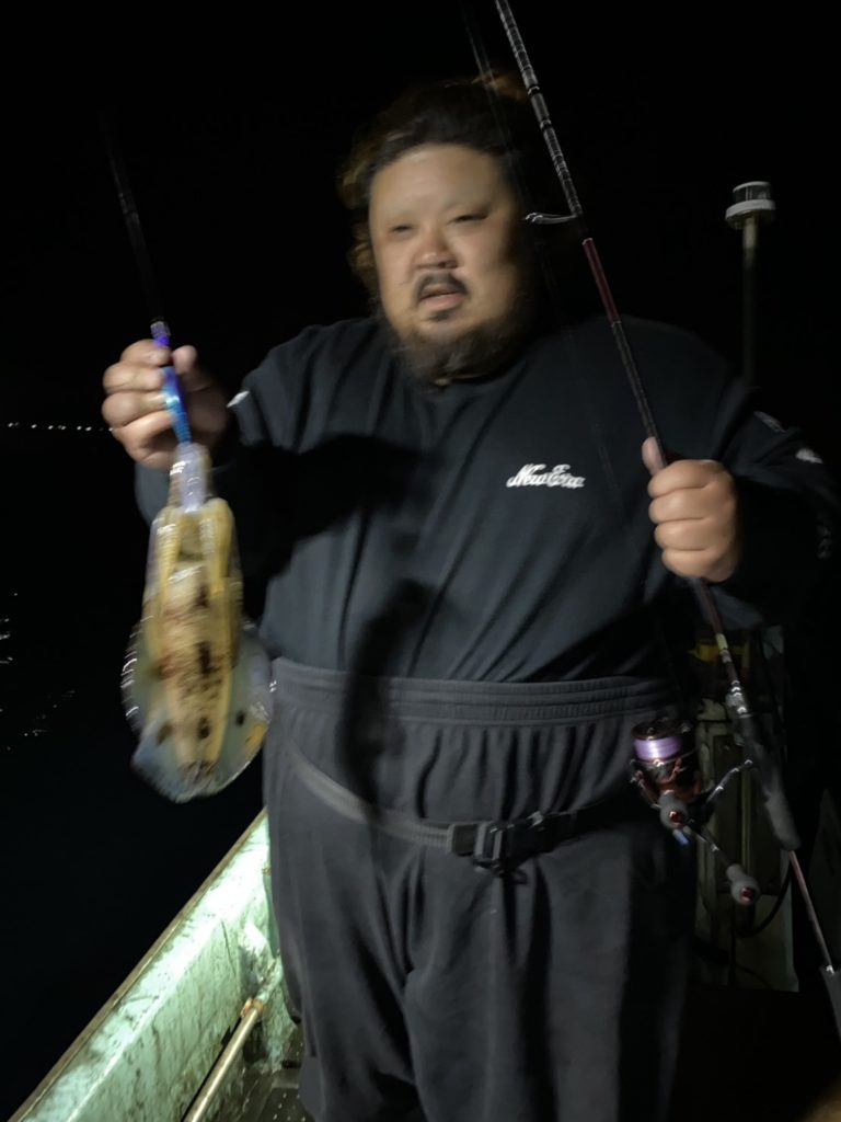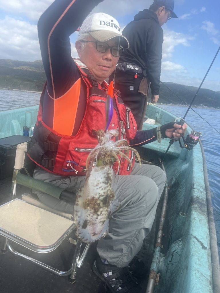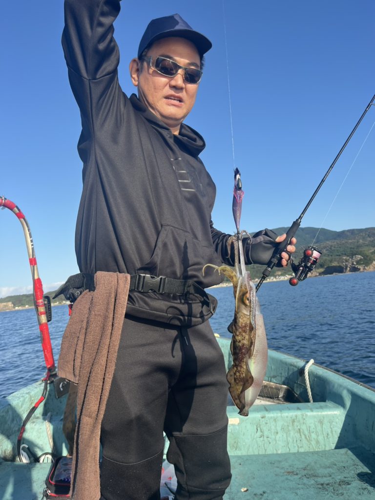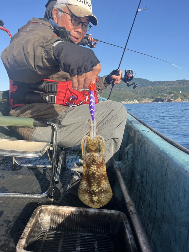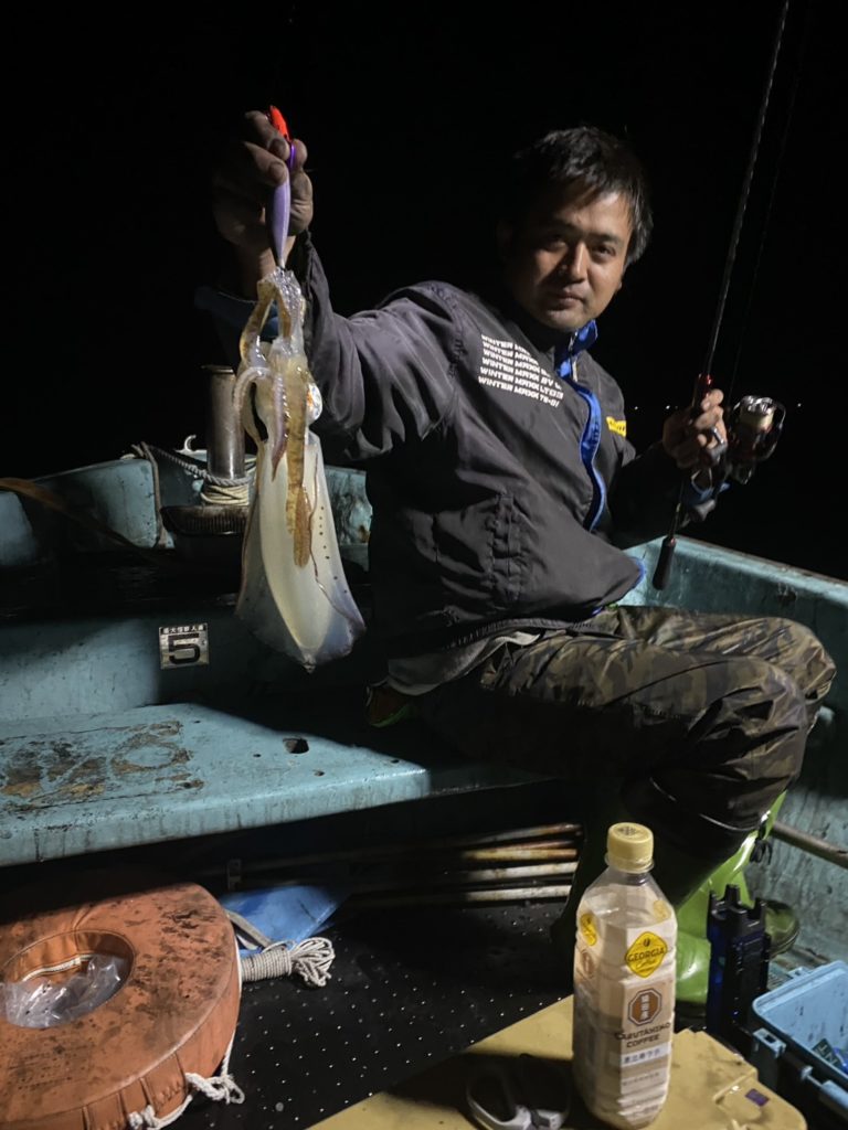 07:51 J 1-1-0-0 ダブルヒット!前から2番目の方は、昨日午前便で初アオリイカ釣果4杯のお客様。二日続けてのご利用です。本日早速釣り上げ、前日と比べどれだけ変わるか注目です☺️
