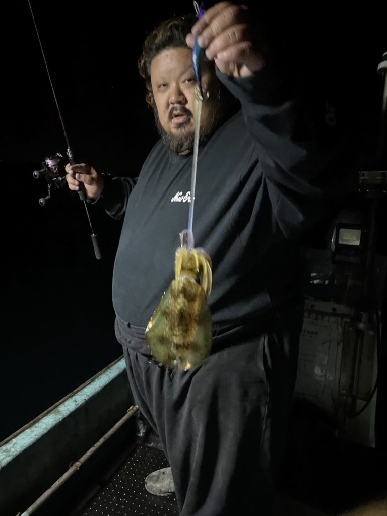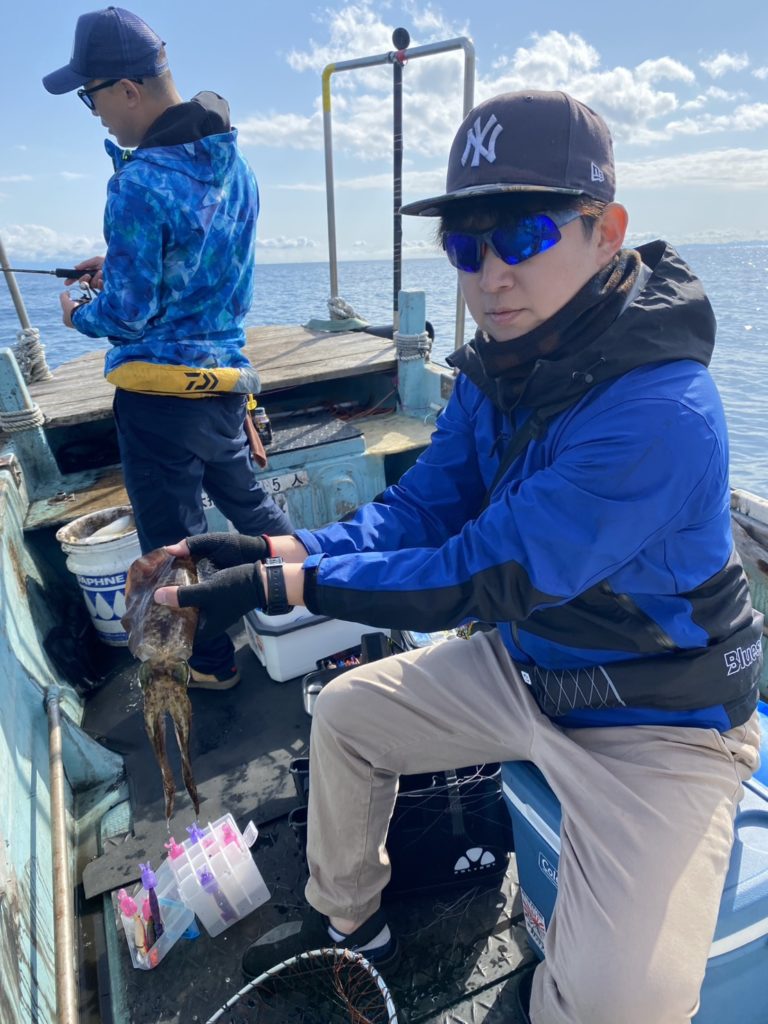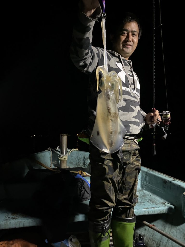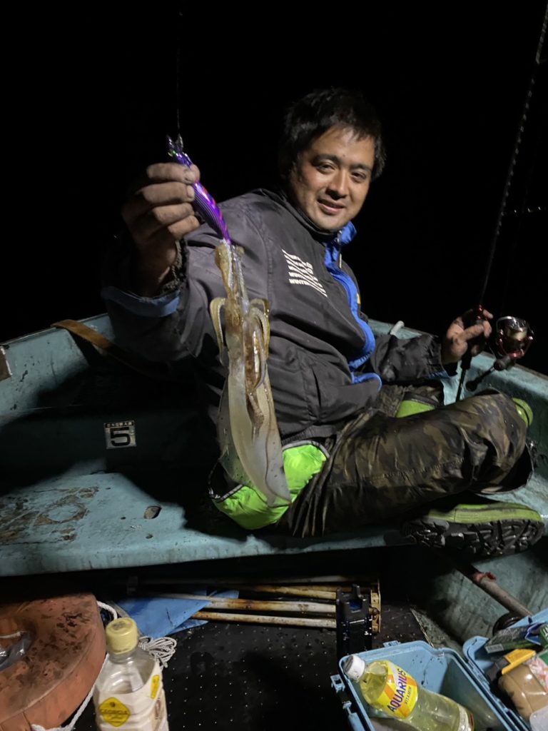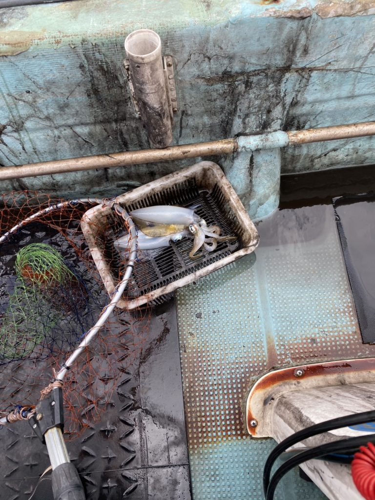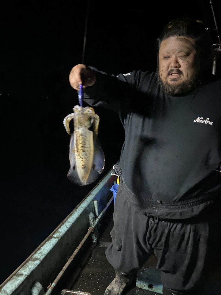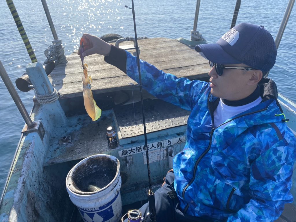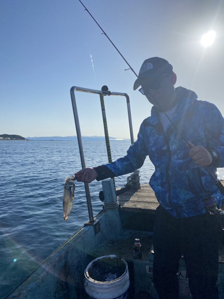 07:51 J 1-1-0-0 ダブルヒット!前から2番目の方は、昨日午前便で初アオリイカ釣果4杯のお客様。二日続けてのご利用です。本日早速釣り上げ、前日と比べどれだけ変わるか注目です☺️