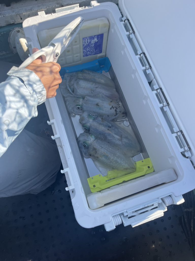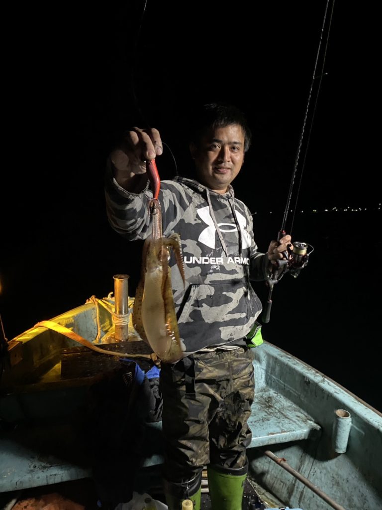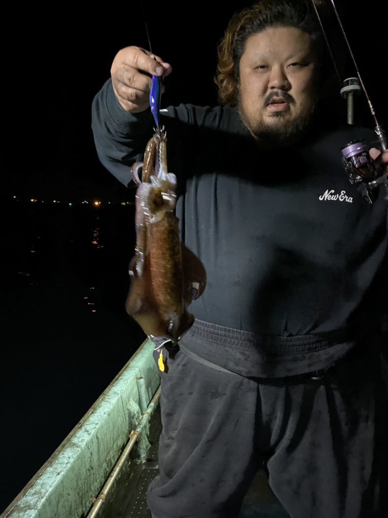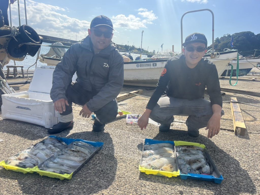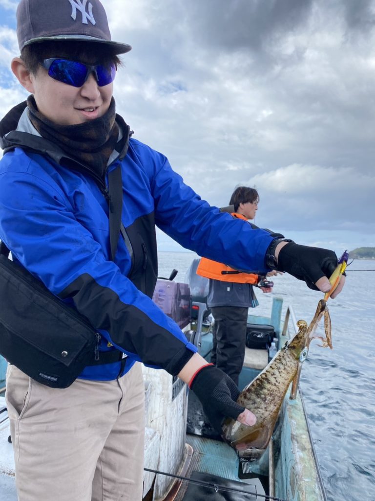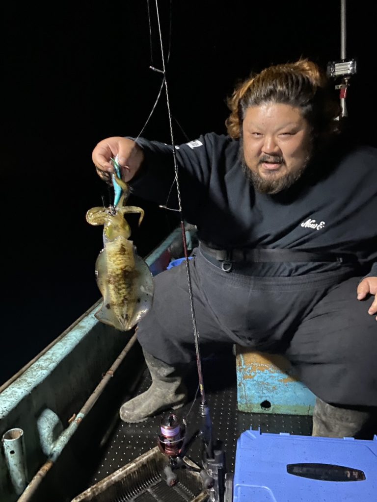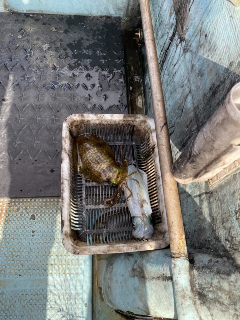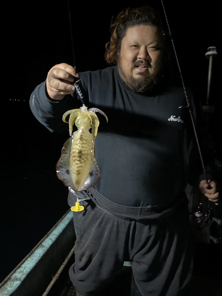07:51 J 1-1-0-0 ダブルヒット!前から2番目の方は、昨日午前便で初アオリイカ釣果4杯のお客様。二日続けてのご利用です。本日早速釣り上げ、前日と比べどれだけ変わるか注目です☺️