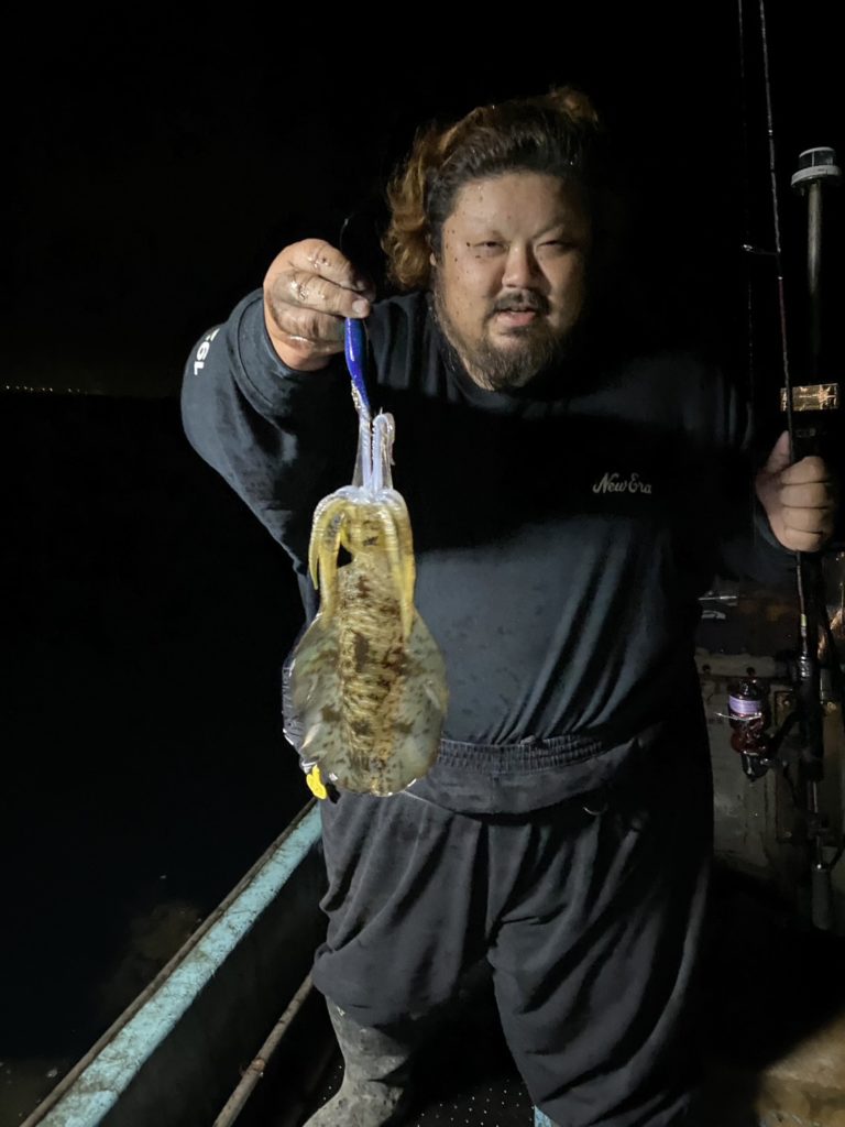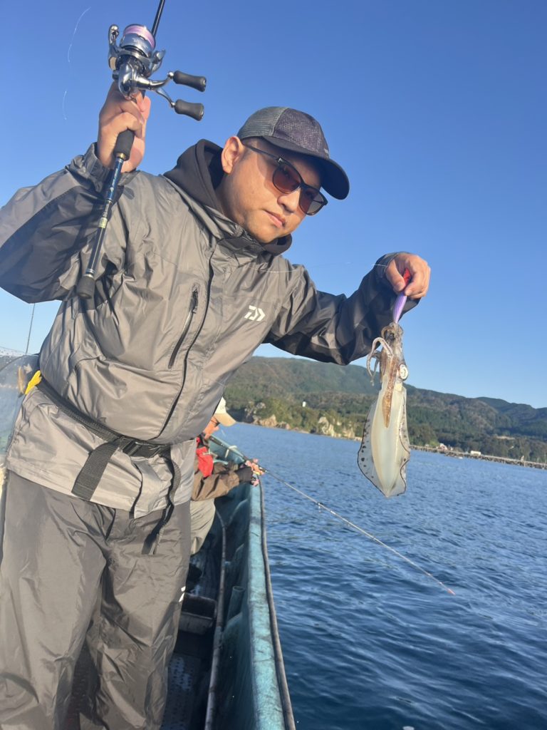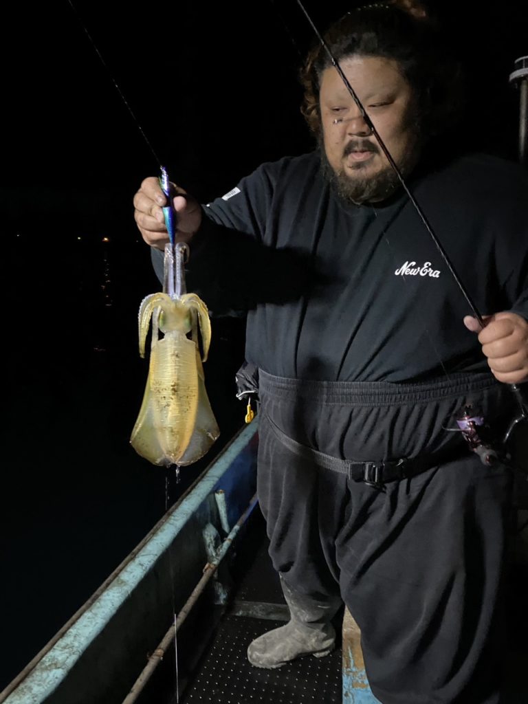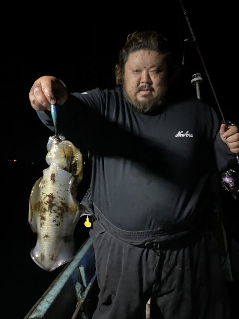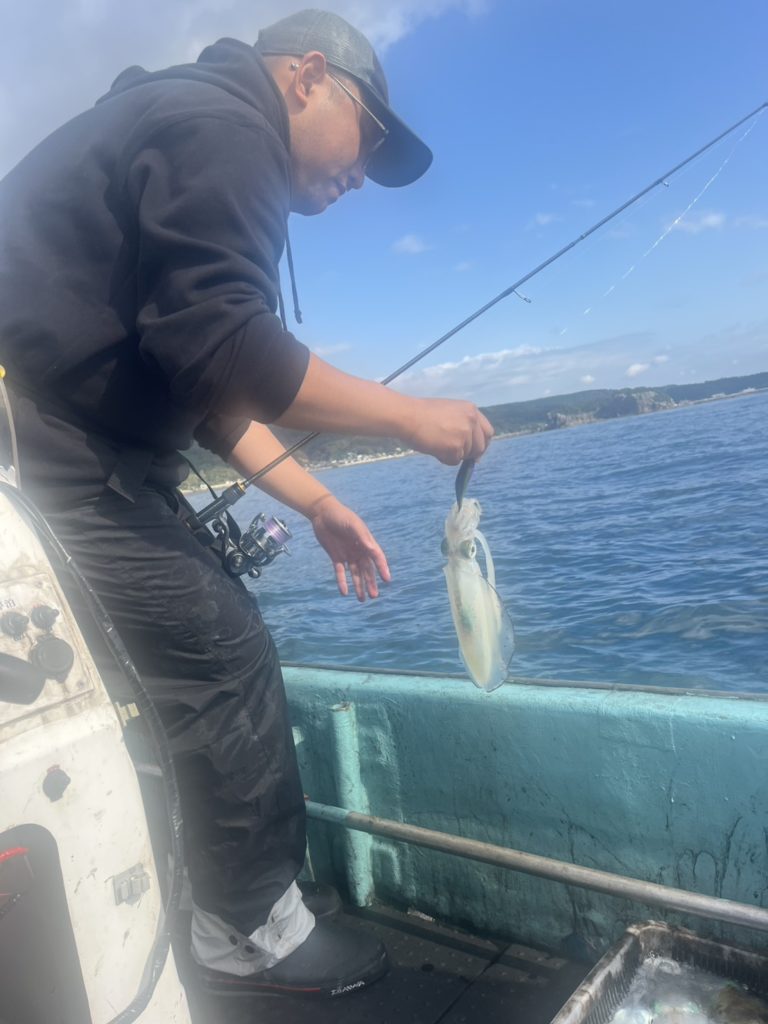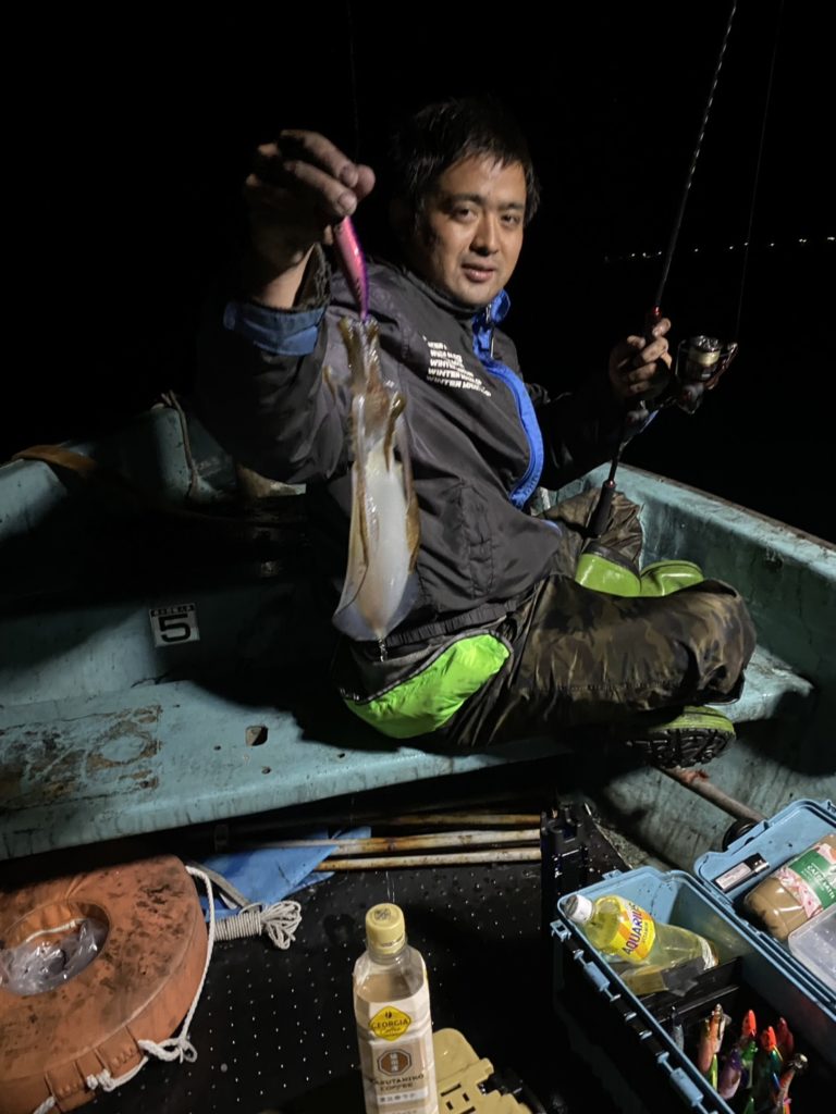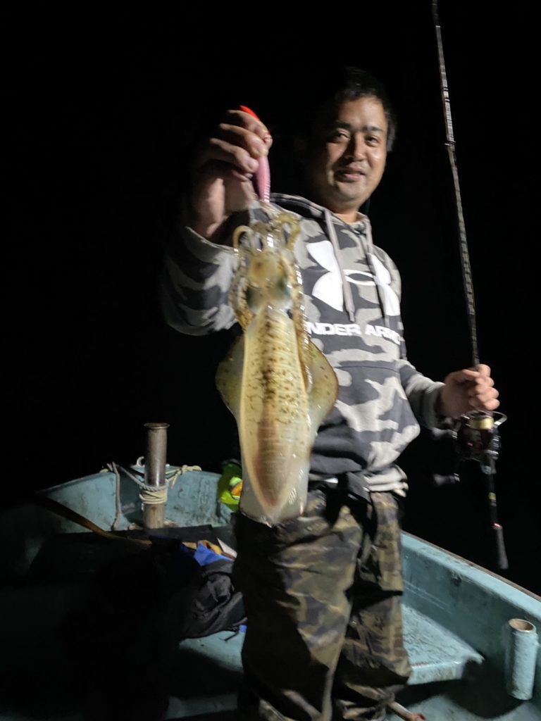 07:51 J 1-1-0-0 ダブルヒット!前から2番目の方は、昨日午前便で初アオリイカ釣果4杯のお客様。二日続けてのご利用です。本日早速釣り上げ、前日と比べどれだけ変わるか注目です☺️
