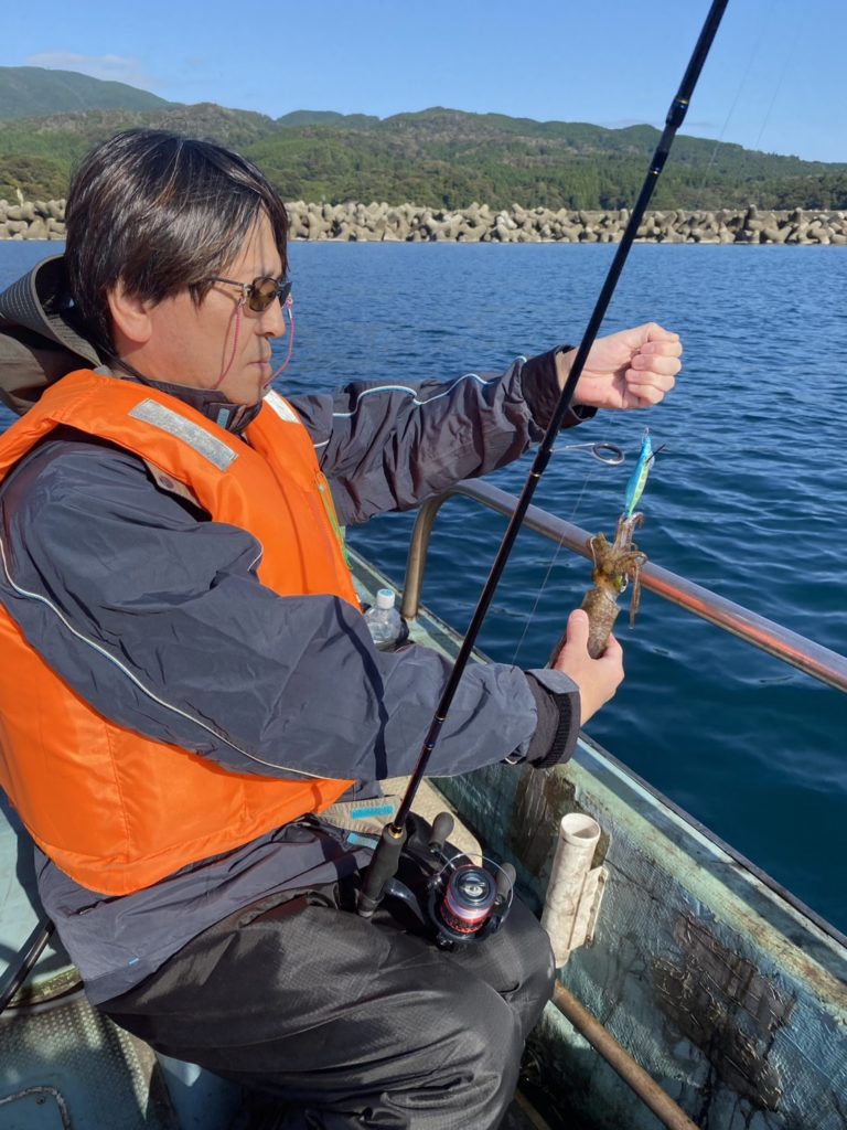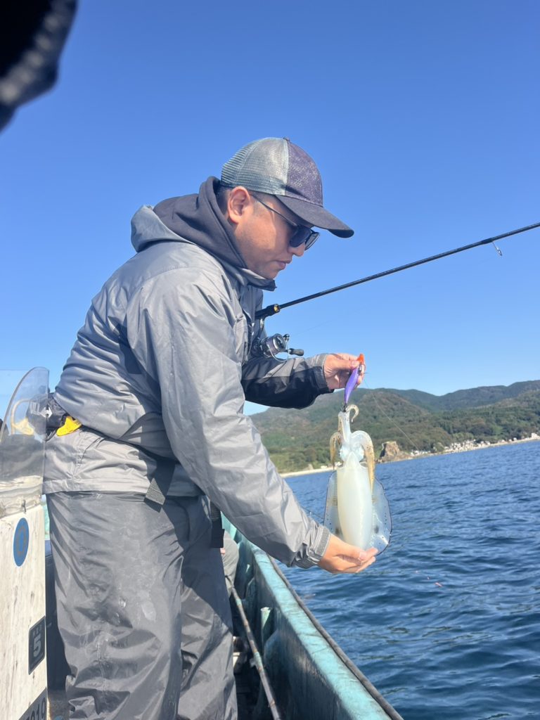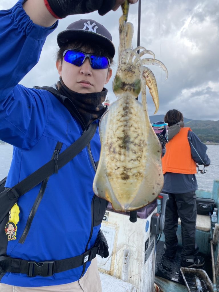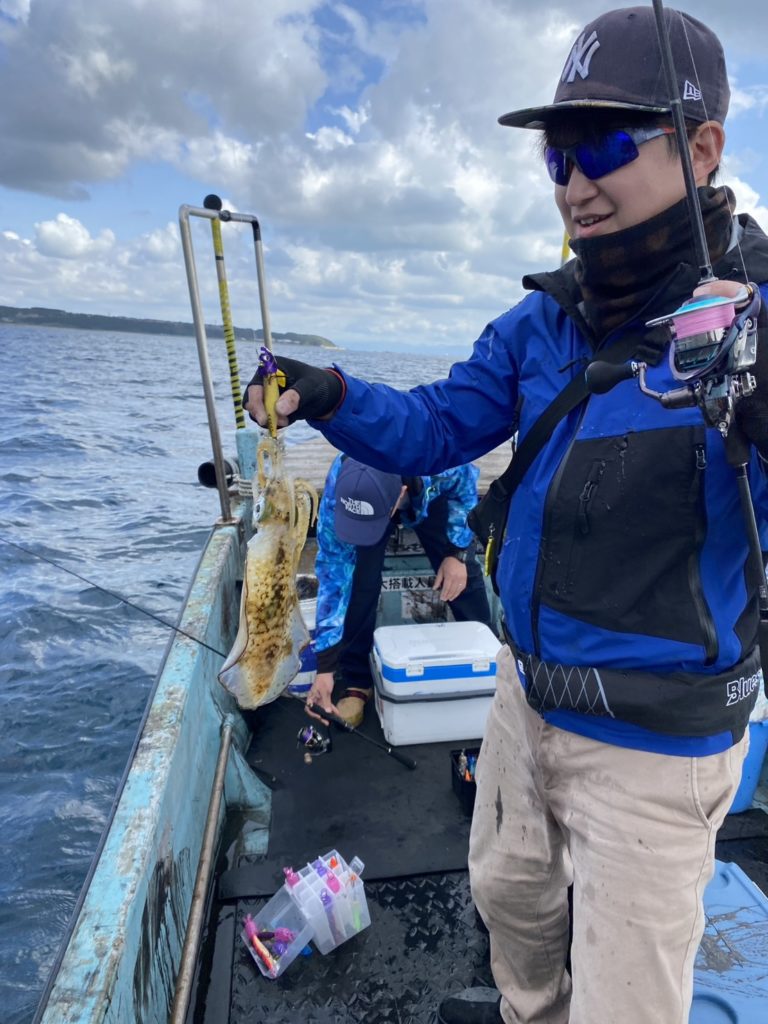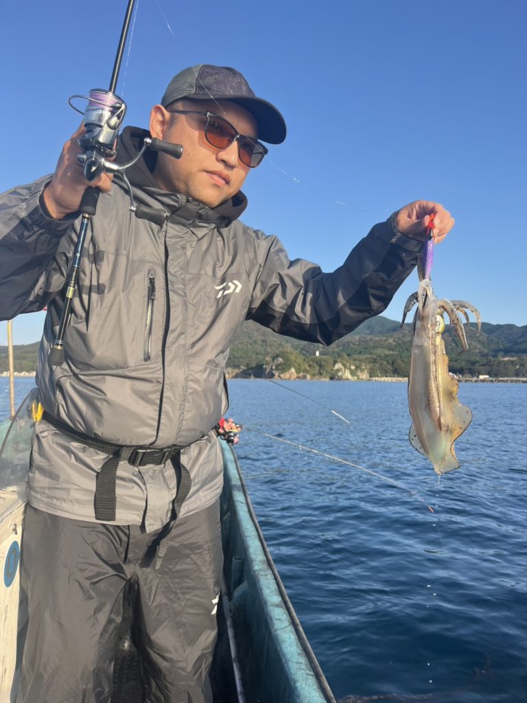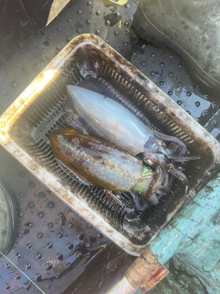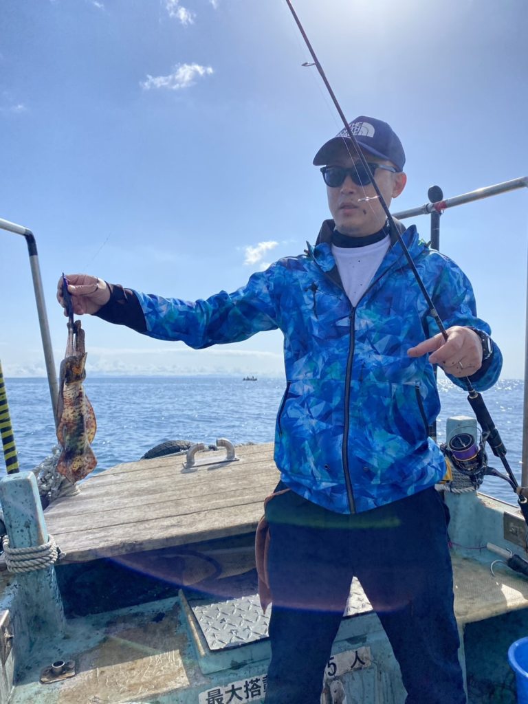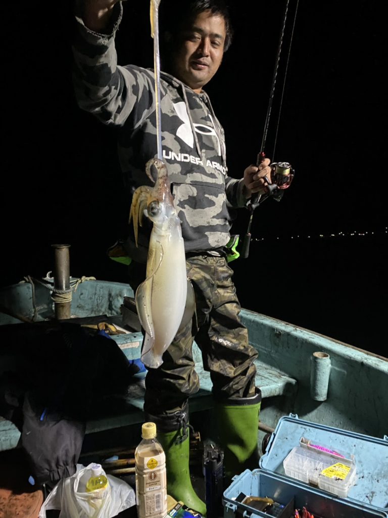 07:51 J 1-1-0-0 ダブルヒット!前から2番目の方は、昨日午前便で初アオリイカ釣果4杯のお客様。二日続けてのご利用です。本日早速釣り上げ、前日と比べどれだけ変わるか注目です☺️