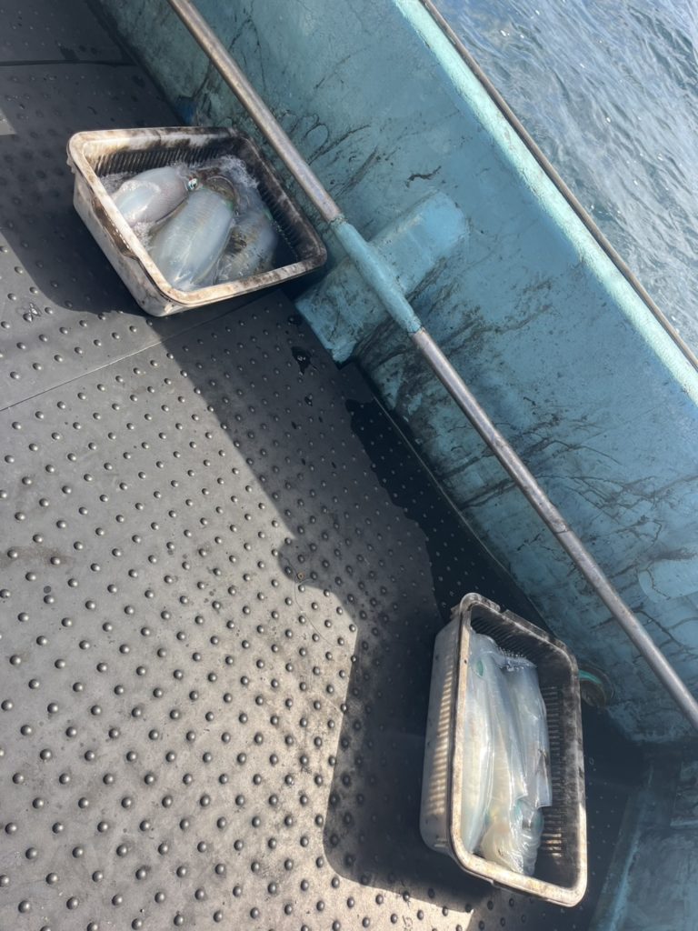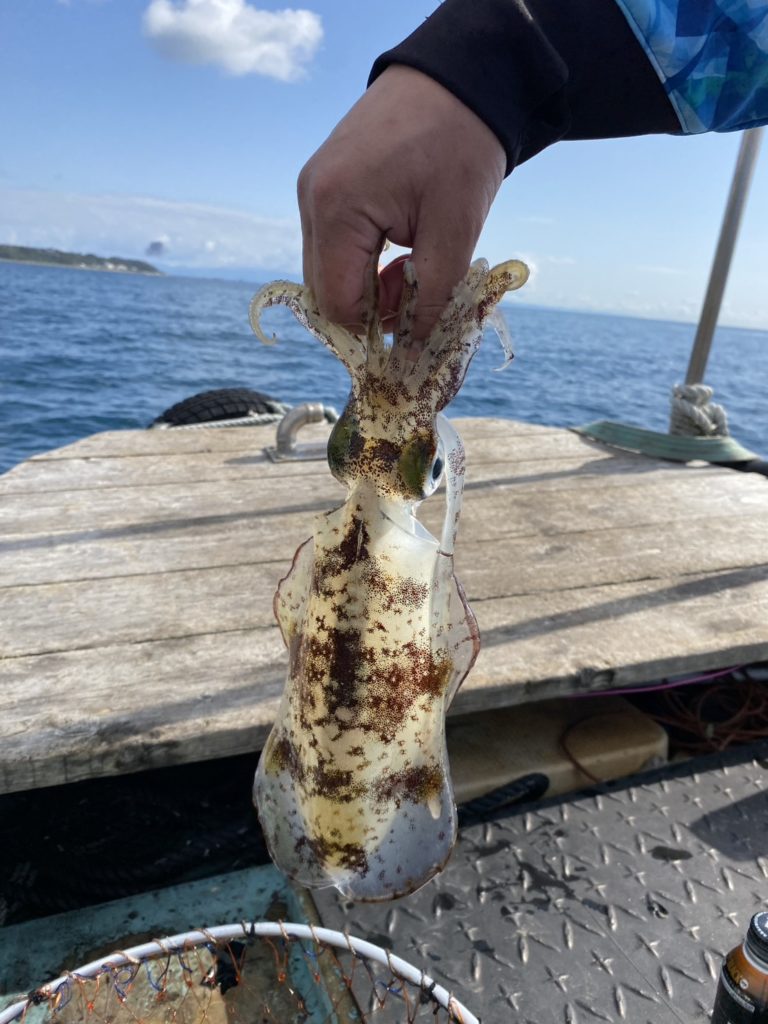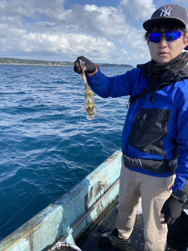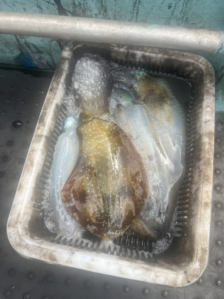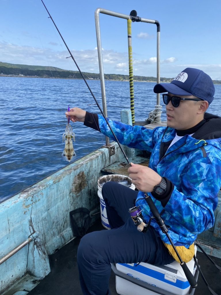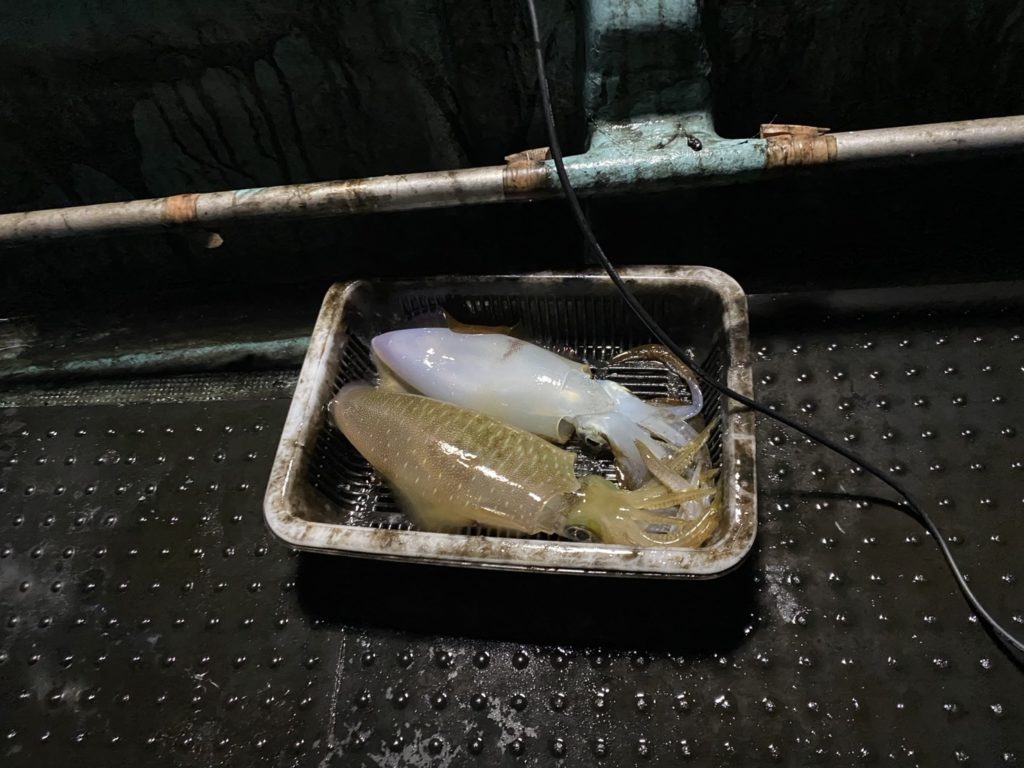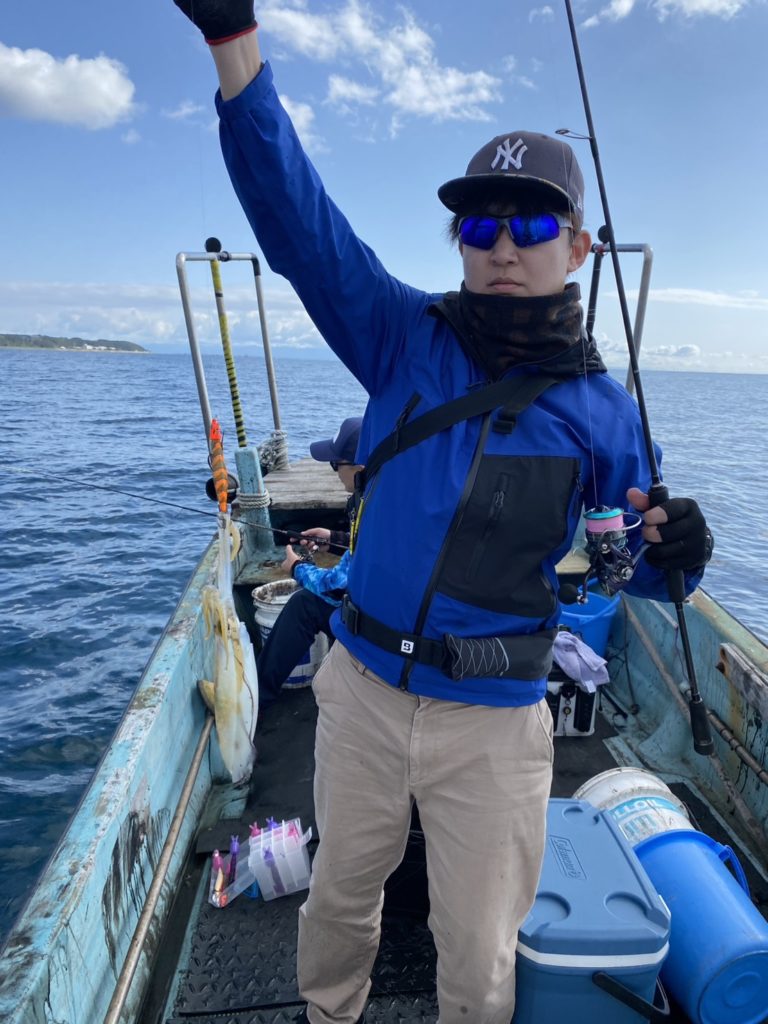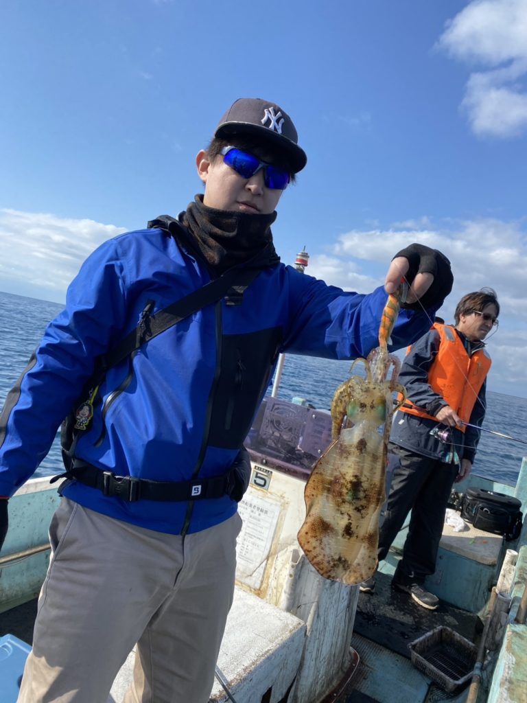 07:51 J 1-1-0-0 ダブルヒット!前から2番目の方は、昨日午前便で初アオリイカ釣果4杯のお客様。二日続けてのご利用です。本日早速釣り上げ、前日と比べどれだけ変わるか注目です☺️