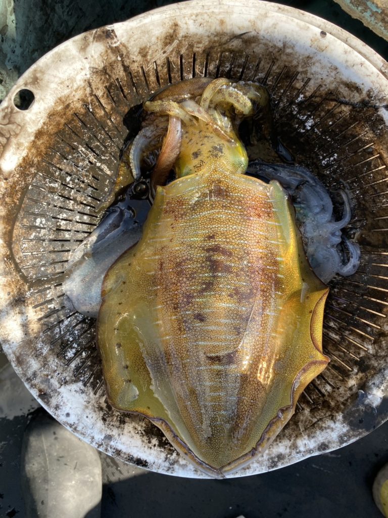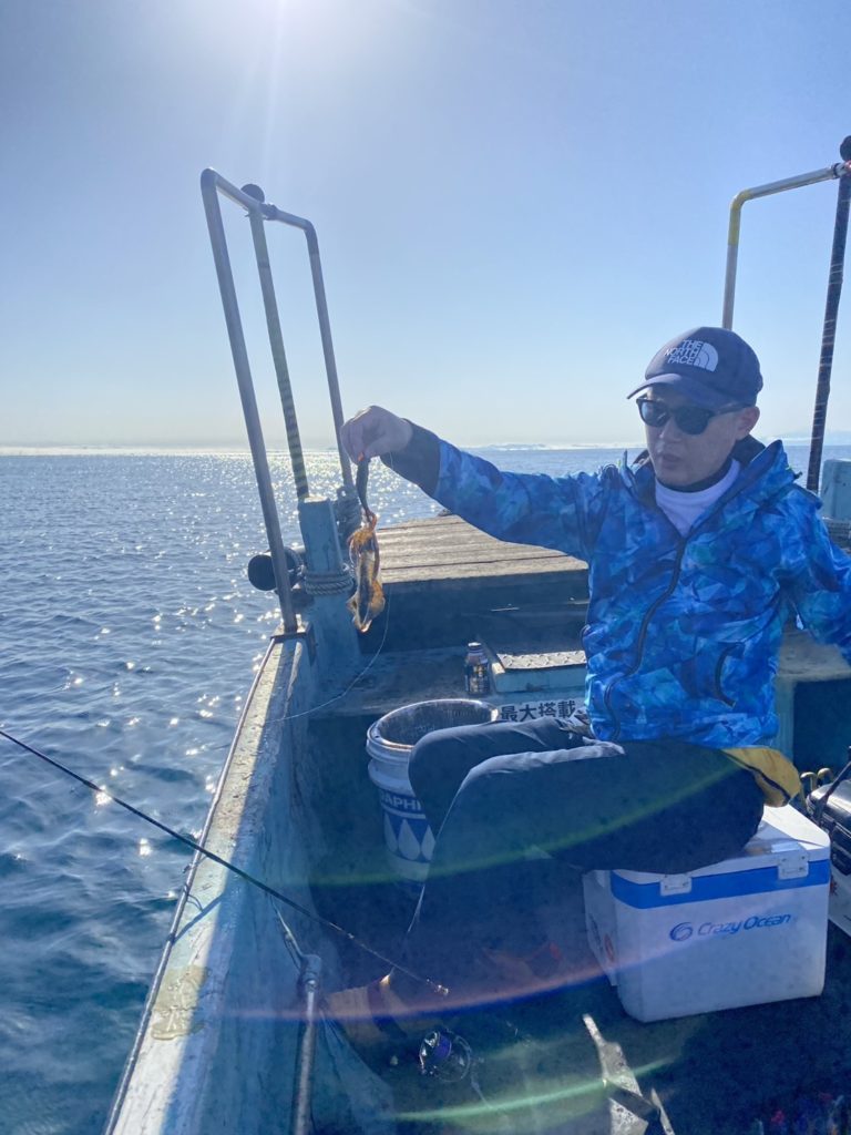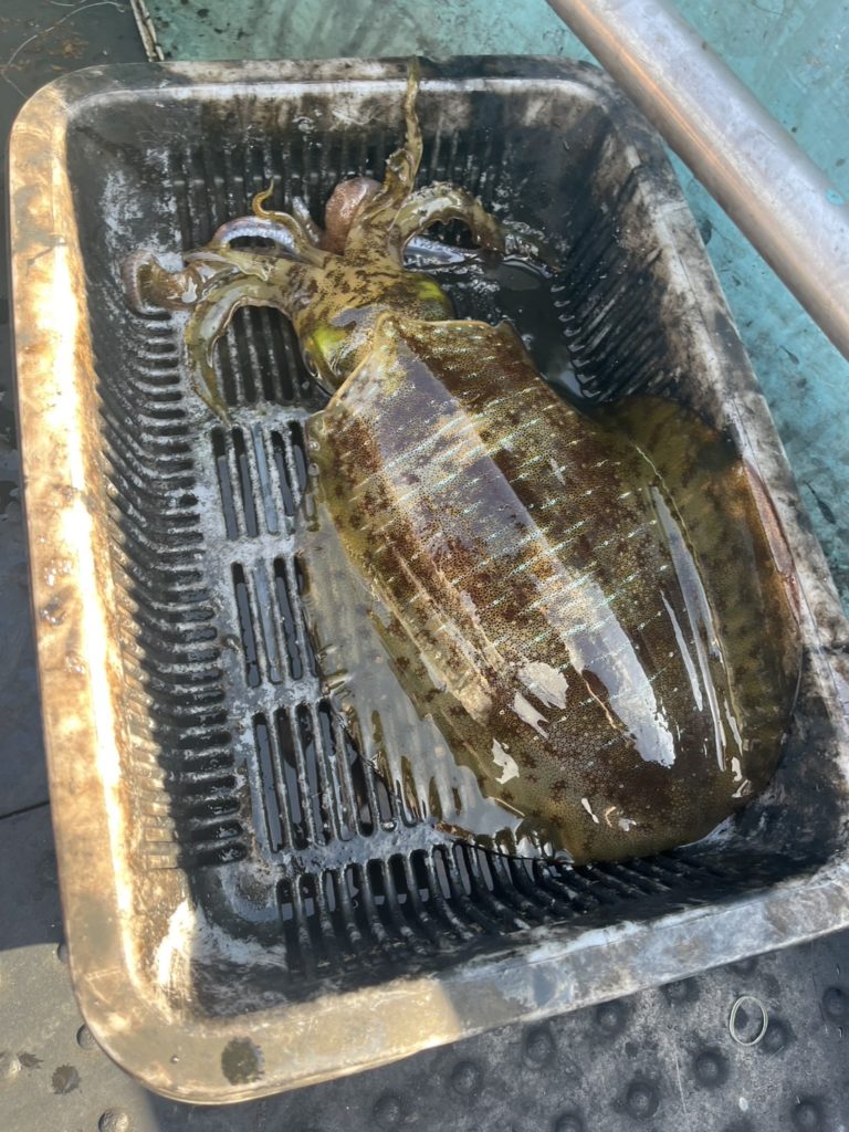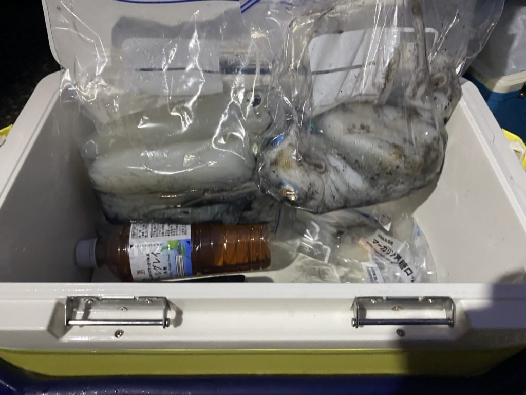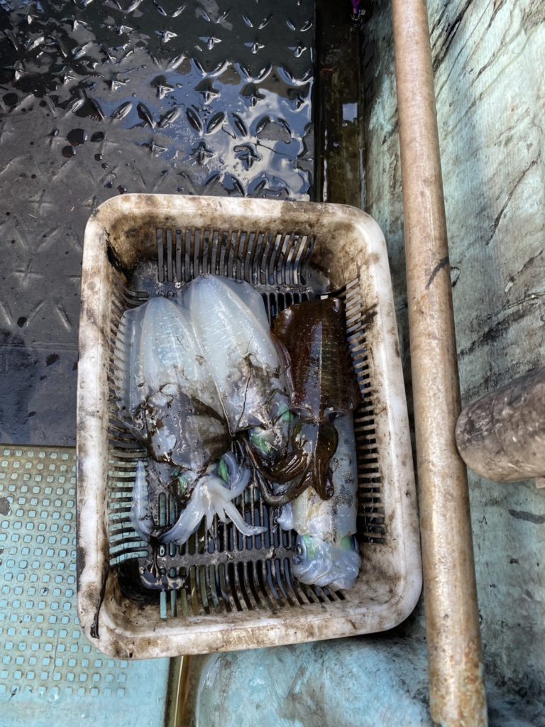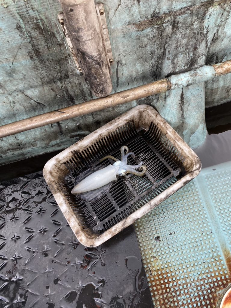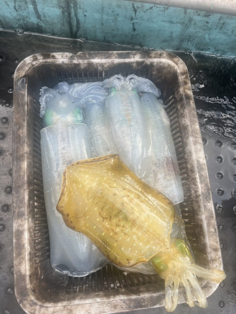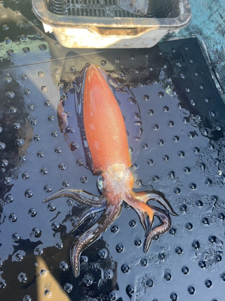 07:51 J 1-1-0-0 ダブルヒット!前から2番目の方は、昨日午前便で初アオリイカ釣果4杯のお客様。二日続けてのご利用です。本日早速釣り上げ、前日と比べどれだけ変わるか注目です☺️