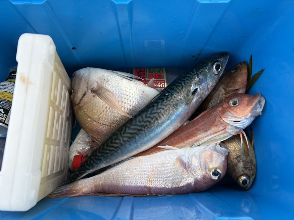 アマダイ、マダイ、ホウボウ、エソ、レンコダイ、サバ、カサゴ、キジハタ、大アジ、アミモンガラ、ヒラマサ。11目達成❣