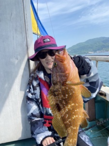 なんといってもMVPは巨大キジハタ、巨大マダイを釣り上げた見事な釣りガールに捧げます🎊朝8時半頃に釣れたこのキジハタですが・・・。とにかく、でっかい!!!